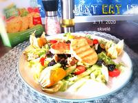 Šalát s goody foody chicken style.... Ľadový šalát, paradajky, uhorka, opražené orechy so sušenými slivkami.... Dresing je javorový sirup, limetka, arašidový olej, soľ 😋