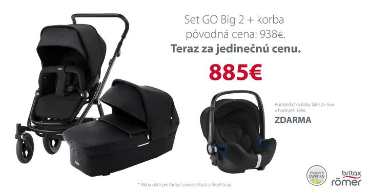 Na Market24 máme jedinečnú cenu na Set Go Big 2 vo farbe Cosmos Black a steel Gray. Slovenskí klienti kliknite tu: http://bit.ly/2oeNcfo českí klienti kliknite tu: http://bit.ly/2pJgX8p Tento set kúpite iba za 885 eur. K tomu od nás získate jedinečnú autosedačku Baby Safe 2 i-Size úplne zadarmo. Set zahŕňa športový kočík, hlbokú korbu, mäkkú vaničku a detskú autosedačku. Kočík prinesie maximálny komfort a je určený už od narodenia dieťatka.