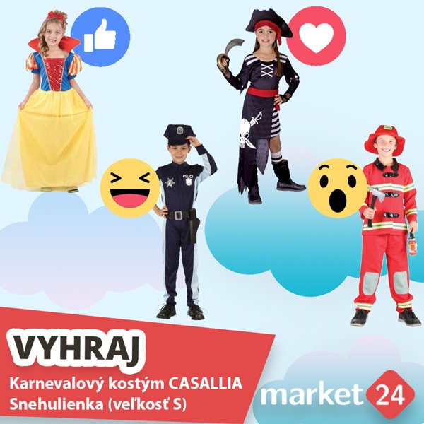 Ktorý z týchto 4 karnevalových kostýmov ste kúpili, alebo plánujete kúpiť na pre vaše deti na karneval? Vybranému kostýmu dajte prosím emotitkon, ktorý je v rohu produktu na našej facebookovej stránke http://bit.ly/2OY0MyX + zdieľajte túto súťaž svojim priateľom. Ak ste si nevybrali, dajte príspevku like a do poznámky uveďte link na iný karnevalový kostým z našej ponuky. Našu širokú ponuku Karnevalových kostýmov nájdu slovenskí klienti na http://bit.ly/2E8hwgU a českí na: http://bit.ly/2E8y1JW . Súťaž je platná do 21. 2. 2019. Následne 22.2. 2019 vyberieme jedného výhercu, ktorému zašleme výhru, perfektný Karnevalový kostým Snehulienka (veľkosť S).