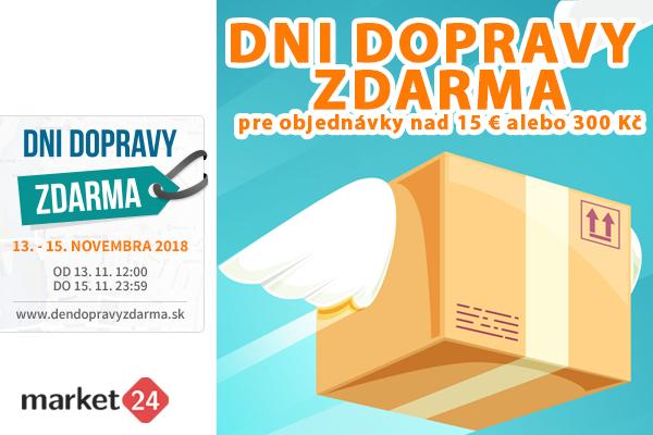 Už len dnes môžete využiť DNI DOPRAVY ZDARMA na Market24 pre objednávky už od 15 € alebo 30 Kč. Slovenskí klienti nájdu tu: http://bit.ly/2zChZWX a českí tu: http://bit.ly/2hvAkyc Nakúpte nad 15 Euro alebo 300 Kč a zaplaťte prevodom alebo kartou vopred a máte DOPRAVU ZDARMA. Vyberte si z ponuky viac ako 8000 produktov na sklade a tovar môžete mať na druhý deň doma. Platnosť pre objednávky od 13.11. od 9:00 do 15.11. 2018 do 23:59.