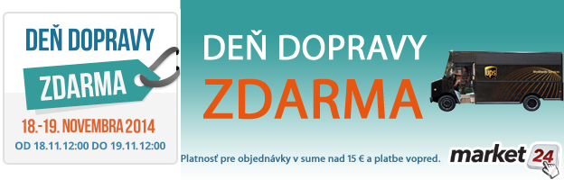 Deň dopravy zdarma na www.market24.sk - od utorka 18.11. od 12.00 do stredy 19.11.2014 do 12:00 nakúpte nad 15 EUR a pri platbe vopred máte doručenie zdarma. Ak chcete mať tovar doma na druhý pracovný deň, vyberte si z ponuky tovaru na sklade viac ako 3000 položiek. www.market24.sk/na-sklade/