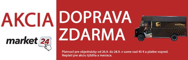 Doprava zadarmo na market24.sk . Od štvrtka 26.09 do soboty 28.09.2013 nakúpte nad 45 EUR a pri platbe vopred máte doručenie zdarma. http://www.market24.sk/ . Potrebujete narýchlo doručiť tovar? Už na druhý pracovný deň môžete ho mať doma: http://www.market24.sk/na-sklade/ Vyberte si z viac ako 330 položiek skladom.