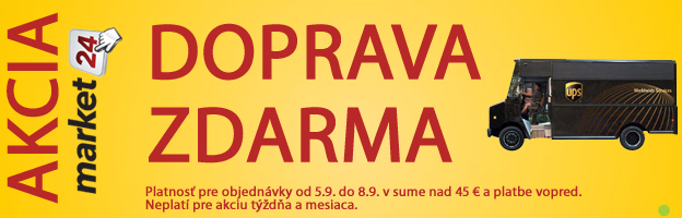 Doprava zdarma na www.market24.sk - od piatka 5.9. do pondelka 8. 9.2014 nakúpte nad 45 EUR a pri platbe vopred máte doručenie zdarma. Ak chcete mať tovar doma na druhý pracovný deň, vyberte si z ponuky tovaru na sklade viac ako 2500 položiek. www.market24.sk/na-sklade/