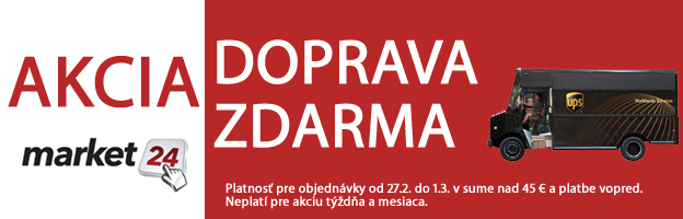 Doprava zdarma na www.market24.sk - od štvrtka 27.2 do soboty 1.3.2014 nakúpte nad 45 EUR a pri platbe vopred máte doručenie zdarma. Ak chcete mať tovar doma na druhý pracovný deň, vyberte si z ponuky tovaru na sklade viac ako 420 položiek. www.market24.sk/na-sklade/