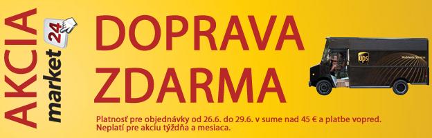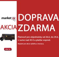 Doprava zdarma na www.market24.sk - od štvrtka 26.6. do nedele 29. 6.2014 nakúpte nad 45 EUR a pri platbe vopred máte doručenie zdarma. Ak chcete mať tovar doma na druhý pracovný deň, vyberte si z ponuky tovaru na sklade viac ako 2500 položiek. www.market24.sk/na-sklade/
