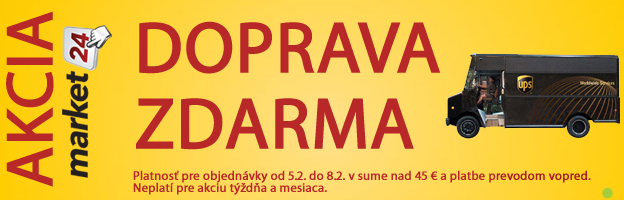 Doprava zdarma na www.market24.sk - od štvrtka 5.2. do nedele 8. 2.2015 nakúpte nad 45 EUR a pri platbe prevodon vopred máte doručenie zdarma. Ak chcete mať tovar doma na druhý pracovný deň, vyberte si z ponuky tovaru na sklade viac ako 4000 položiek. www.market24.sk/na-sklade/