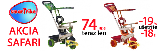 Novinky - trojkolky Smart Trike Joy a Spark už skladom. Recliner, Zoo aj Dream Touch - u nás skladom a za akciové ceny: http://www.market24.sk/smart-trike/ U nás si vyberiete aj zo širokej ponuky kočíkov - či už sety od narodenia športové kočíky a golfové palice: http://www.market24.sk/kociky/ Značky Casualplay, Cosatto, Concord, Gesslein, ABC Design, Jané, Britax, Be Cool a iné.