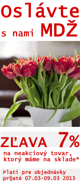 Pri príležitosti MDŽ získajte zľavu 7%. Objednajte si v termíne 07.03-09.03 tovar, ktorý máme na sklade. Zľava bude odpočítaná z faktúry (platba vopred i na dobierku). Zľavu nie je možné aplikovať na tovar Akcia týždňa, mesiaca a fusaky Kaiser