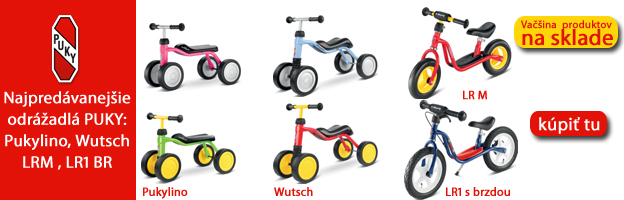 Trojkolky PUKY Ceety, odrážadlá PUKY Wutsch, Pukylino, LRM, LR1L, LR1L s brzdou aj LR XL máme skladom: http://www.market24.sk/puky/ Skladom máme aj iný tovar, viac ako 460 tovarových položiek: http://www.market24.sk/na-sklade/ Vybrať si môžete trojkolky, vložky do kočíka, nánožník, hračky, ležadlá, topánočky, odrážadlá, deky, osušky, nočníky, redukcie...