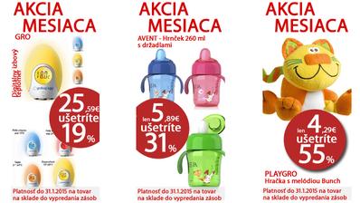 Aj v januári sme pre vás pripravili akciu mesiaca, v ktorej ušetríte až do 55%: http://www.market24.sk/akcia-mesiaca/ Avent hrnčeky, teplomer do detskej izbičky, pršiplášte s motívom Planes a Minnie, Playgro hračky, ISO tanier od Vital baby i produkty značky Blaumann. U nás si vyberiete aj autosedačky všetkých váhových kategórií: http://www.market24.sk/autosedacky/