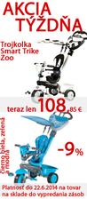 V novej akcii týždňa ušetríte až do 30%: http://www.market24.sk/akcia-tyzdna/ Trojkolka Smart Trike ZOO, Wallaboo zavinovačka Jolie, Bobas deky, Snuza monitor dychu Hero, Avent hrnček s držadlami a Bright Starts ležadlá. Väčšina tovaru skladom, tak ako aj mnoho ďalších položiek u nás: http://www.market24.sk/na-sklade/