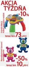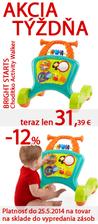 V novej akcii týždňa ušetríte až do 50%: http://www.market24.sk/akcia-tyzdna/ Odrážadlá First Bike a Ybike, Fisher Price stolček a speváčikovia, Bobas deky, Bright Starts chodítko a Avent fľašky so slamkou.. Väčšina tovaru skladom. Skladom u nás viac ako 2500 tovarov, vyberajte a do druhého pracovného dňa ho môžete mať doma: http://www.market24.sk/na-sklade/