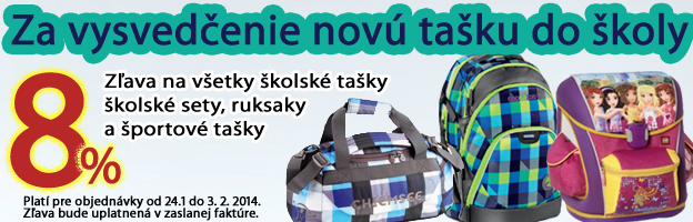 Za vysvedčenie novú tašku so zľavou 8% http://www.market24.sk/skolske-potreby/ ktorá bude odpočítaná na faktúre. V termíne od 24.01 do 03.02.2014. Platí len pre školské tašky, sety, ruksaky, športové tašky.