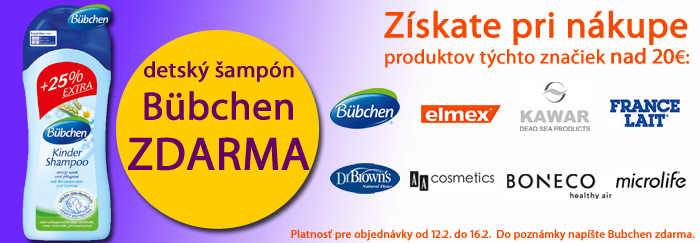 Zdarma detský šampón Bübchen získate pri nákupe týchto značiek v sume nad 20 Euro: Bübchen, Elmex, Kawar, France Lait, Dr. Browns, AA cosmetics, Boneco a Microlife www.market24.sk/krasa-a-zdravie/
