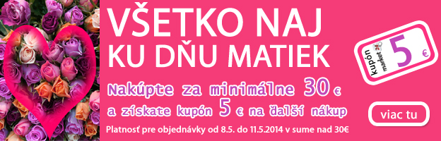 Všetkým mamičkám a budúcim mamičkám želáme všetko najlepšie ku Dňu matiek. Nakúpte v našom obchode od štvrtka 08.05 do nedele 11.05 v min. hodnote 30 EUR a zdarma získate kupón na ďalší nákup v hodnote 5 EUR. Vyberte si napr. zo širokej ponuky kočíkov: http://www.market24.sk/kociky/ alebo ak často cestujete: http://www.market24.sk/kufriky-cestovanie-s-detmi/ pomocníkov pri cestovaní s deťmi.