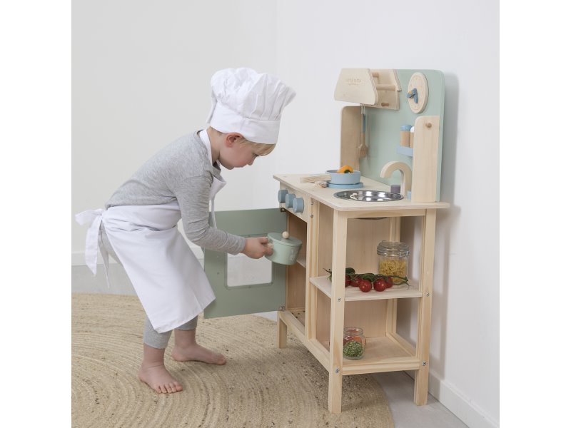 Váš malý šéfkuchár môže piecť a vyprážať v tejto kompletnej drevenej kuchyni Little Dutch. Kuchynka obsahuje hodiny, veľa riadu, drez, otváraciu rúru s magnetkou, kohútik. Kuchynka je dodávaná s extra nástavcami (6 cm), ktoré možno pripevniť pod nohy kuchyne, takže váš malý šéfkuchár si môže vychutnať potešenie z varenia mnoho rokov.