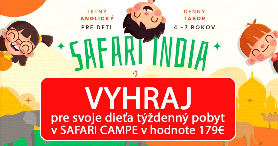 Pozor! - už len dnes do polnoci beží SUPER SÚŤAŽ o jedinečný týždenný pobyt v letnom dennom SAFARI CAMPE INDIA v anglickom jazyku pre deti od 4 do 7 rokov v hodnote 179€. Stačí dať like našej facebookovej stránke http://bit.ly/2OY0MyX , zdieľať ju vašim priateľom a uviesť do komentu, koľký ročník SAFARI CAMPU, anglického tábora pre deti, sa bude konať toto leto ? Správnu odpoveď a viac informácii o SAFARI CAMPE nájdete tu: http://bit.ly/2K8BB7S Prosíme nekopírovať odpovede iných súťažiacich zo stránky. Radi by sme poznali váš názor. Platnosť súťaže od 11.3.do 16.3. 2019.