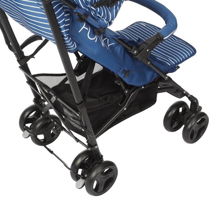 Funky je vybavený 5-polohovým operadlom, vnútorným polstrovaním a nastaviteľnou opierkou nôh a odnímateľnou lakťovou opierkou s reflexným materiálom, čo z neho robí veľmi pohodlný kočík.