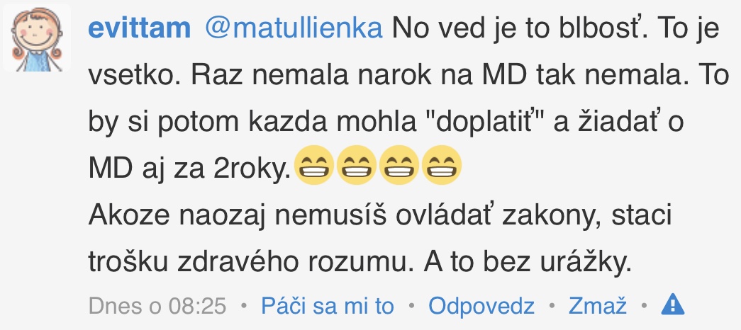 @matullienka No ved je to blbosť. To je vsetko. Raz nemala narok na MD tak nemala. To by si potom kazda mohla "doplatiť" a žiadať o MD aj za 2roky.😁😁😁😁