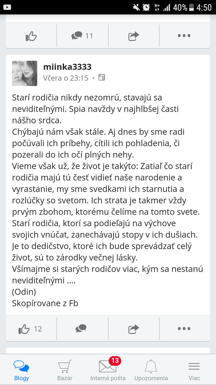 To je smutné... moji rodičia bohužiaľ nežijú vyše 12,rokov...ale keď žili zažili moju najstaršiu a venovali sa jej ocko jej volal každý deň milovali ju...robili jej program... mám teraz svokru okolo 200km od nás za 15,rokov u nás bola asi 6 krát...že nemôže lebo robí potom nerobí potom že je pn potom že sa stará o mamu...my chodíme raz za rok v lete... kedysi sme viacej chodili ale som sa z toho dlho spamätáva la....ona zavolá na meniny narodky pošle peniaze...inak veľký záujem nie je dokonca prostredná jej aj vykala niekedy....ona skôr muž čo má brata tak jeho deti chlapcov má radšej a navštevuje ich. .. takže moje deti sú fakticky bez starých rodičov čo už