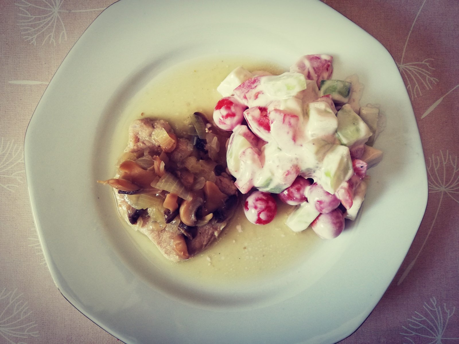 Bravčovinka na hubách a cibuli plus šalát s domácej záhradky s kyslou smotanou