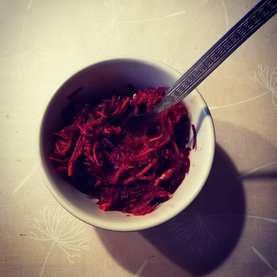 Surová cvikla, jablká a mrkva plus lyžica mletej skorice