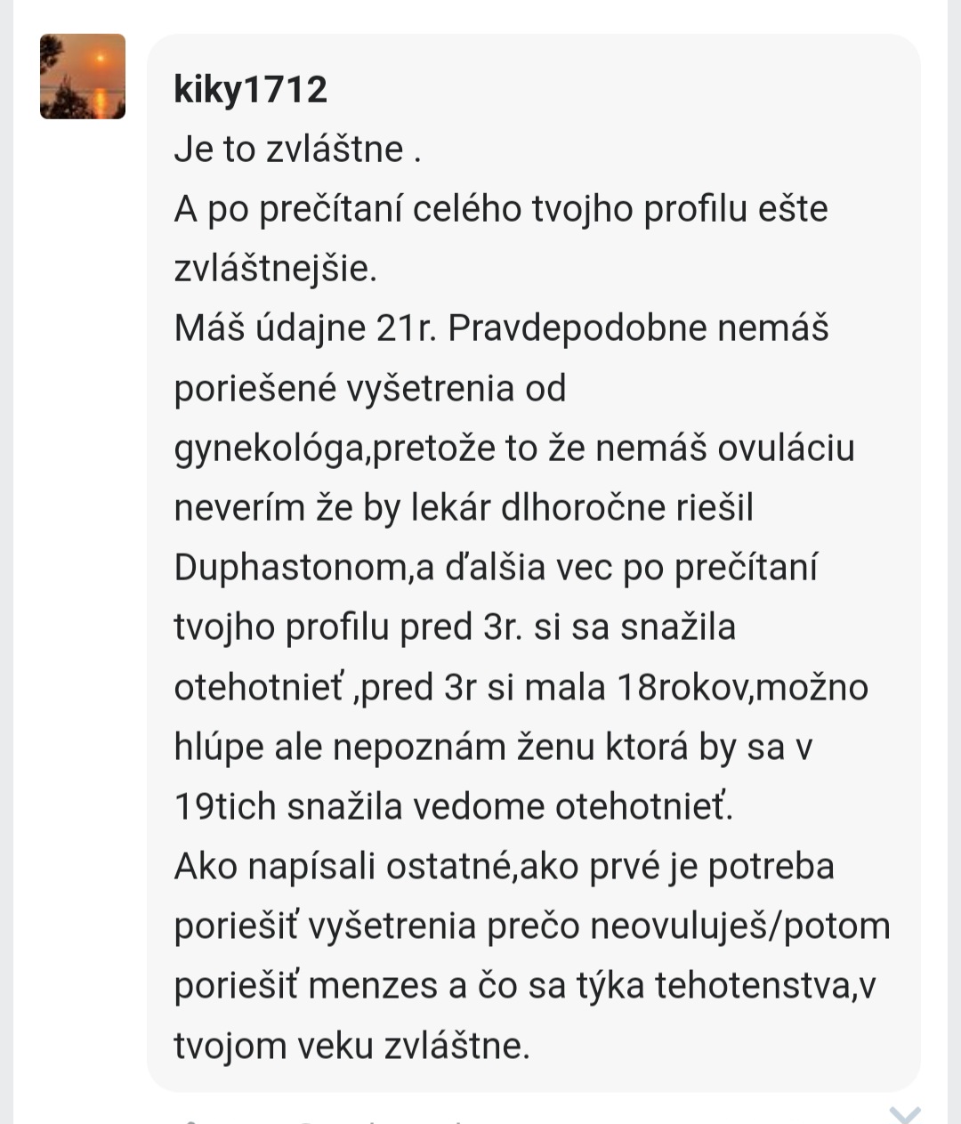 Máš údajne 21r. Pravdepodobne nemáš poriešené vyšetrenia od gynekológa,pretože to že nemáš ovuláciu neverím že by lekár dlhoročne riešil Duphastonom,a ďalšia vec po prečítaní tvojho profilu pred 3r. si sa snažila otehotnieť ,pred 3r si mala 18rokov,možno hlúpe ale nepoznám ženu ktorá by sa v 19tich snažila vedome otehotnieť.