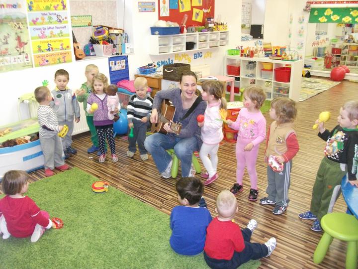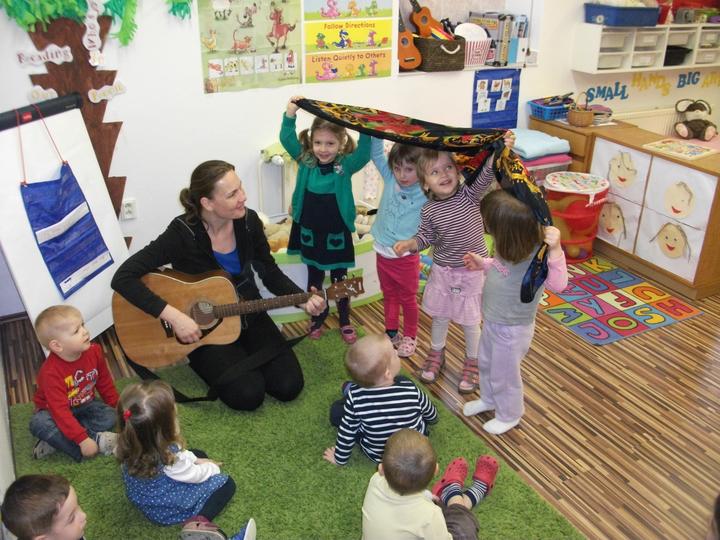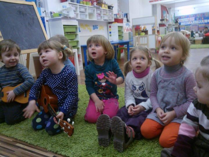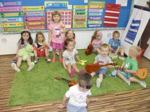 V našej škôlke realizujeme hudobný program KINDERMUSIC (pre viac info pozri http://www.kindermusik.com/about/kindermusik-at-home/) .Našou lektorkou je linecnovaná pedagogička z USA, ktorá raz týždenne prichádza za deťmi a rozvíja hudobné zručnosti detí v rámci uvedeného programu.Deti denne spievajú so sprievodom hudobných nástrojov ako je gitara, klavír, hrajú na detské hudobné nástroje, a dychové hudobné nástroje.Hrajú na flaute a na ústnych harmonikách. Hra na flaute pôsobí okrem iného priaznivo aj na dýchacie orgány a mnoho pediatrov ju odporúča pre deti s častými dýchacími ochoreniami. Deti sa dostávajú do kontaktu s perkusiami, oboznamujú sa aj so základmi teéorie hudby- učia sa poznávať dĺžku nôt, vytileskať rytmický notový zápis.Deti sa oboznamujú aj s takými vecami, ako napríklad digitálny záznam ich hlasu, práca s mikrofónom, vystupovanie pred inými a sólový prejav, kedy sa učia sebavedomo a bez obáv vystupovať pred druhými. Do programu zaraďujeme aj muzikoterapiu, maľovanie na hudbu a iné hudobné aktivity.