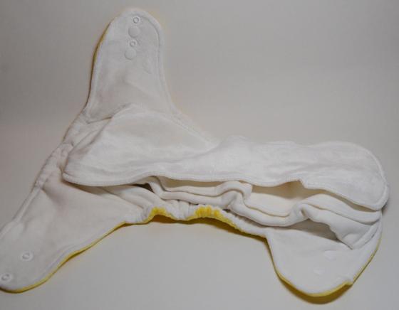 Samotné nohavičky: 2 vrstvy pleteného bambusového flisu (67% bambus / 27 % biobavlna / 6% spandex), gramáže 340g/m2. Vo vnútri sú všité ďalšie 2 vrstvy (neviem presne čo). Samostatná vkladačka je z 3 vrstiev bambusového flisu s rozmerom 38 x 12,5/10cm. Naskladáte si ju podľa potreby (po celej dĺžke alebo preloženú na polovicu v prednej časti). Kompletná plienka má teda 7 savých vrstiev. Ak vpredu preložíte vkladačku na polovicu, máte vpredu 9 vrstiev.