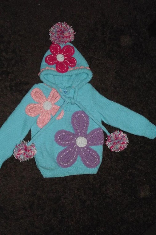 štrikovaný svetrík, doladený hačkovanými kvetmi, veľkosť na 1-2 roky