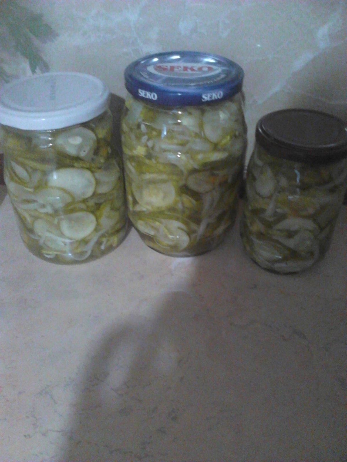 3 kg uhorky - prerastené a nelúpiť 0,5 kg paprik 0,5 g cibuľa 1 nakladáč 1/2 l octu 40 Dg cukru Uhorky nelupiť, narezat na kolieska, papriku na rezance a cibuľu na pásiky. premiešať pridať naladáč, ocot a cukor, premiešať a nechať stát 2 hodiny občas premiešať. Uhorky pústia šťavu, bude jej dosť. naložiť do sklíčok a zasterilizovať. Ja nechávam povrieť 2 - min. a vyberám z hrnca. 🙂 Z uvedeného množstva mi vyšlo 6 pohárov od horčice a 2 ks 7dcl poháre.