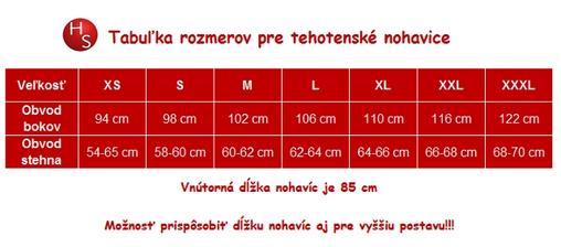 Tehotenské nohavice sú vyrobené z materiálov 1. akosti, tehotenský pás je z eco friendly materiálov. Štandarne sa nohavice šijú na objednávku, doba dodania je do 3 týždňov, avšak niektoré modely mávame na sklade. Vnútorná dĺžka tehotenských nohavíc je 85 cm. Dôležité upozornenie: ak sa chystáte tehotenské nohavice skrátiť, doporučujeme ich pred tým vyprať z dôvodu, že materiál sa môže mierne zraziť (nie je však pravidlom). K tehotenským nohaviciam je veľkostná tabuľka. Vyberajte si veľkosť, akú Ste nosili pred tehotenstvom. Reálna odchýlka rozmerov oproti tabuľke sa môželíšiť o +/ 1 cm. Tehotenské oblečenie - konkrétne tehotenské nohavice a sukne majú vo vrchnej časti pása gumičku, ktorá má v zadnej časti možnosť posúvať sa podľa toho, ako rastie Vaše tehotenské bruško. Je to z toho dôvodu zabezpečenia komfortu nastávajúcej mamičky.