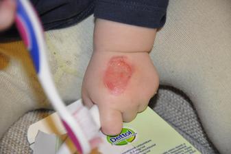 je to popalenina ,najprv sa nam spravil plusgier,potom nam to prasklo a odstranila sa vrchna spalena koza,,,do rany davame inadine,tzv. sietka napustena jodom a dezinfikujeme len detolom,,,akonahle mu necham rucku volne rozviazanu,,,poskodi si tu novu kozu...neviete nieto nieco na rychle hojenie