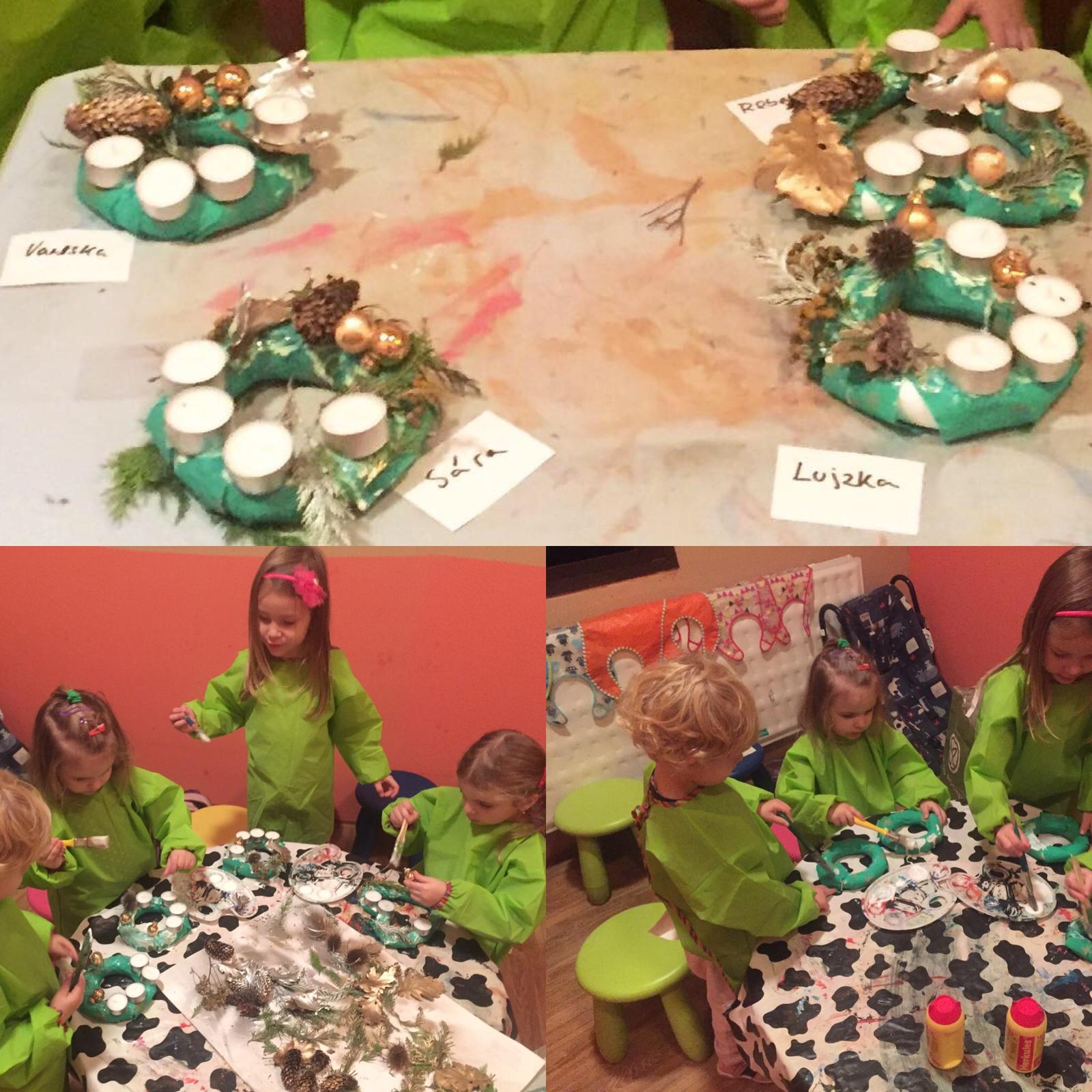 Mini adventny veniec : polyst. kruh obaleny krepovym papierom. Dekoracie lepene s lepidlom Herkules. Prirodne dekoracie striekane sprejom.