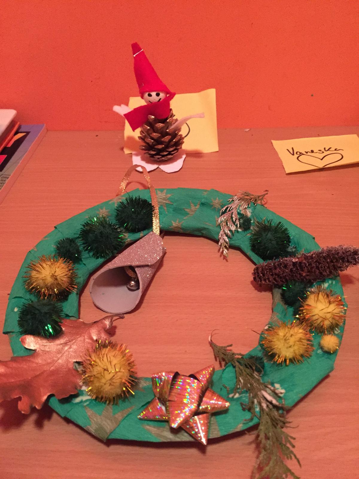 Vianocny veniec - vianocna ozdoba na vchodove dvere :) vystrihneme kruh z papieroveho taniera a obalime krepovim papierom a na to prilepujeme dekoracie disperznym lepidlom Herkules :) pridali sme ozdobu zvonec :)