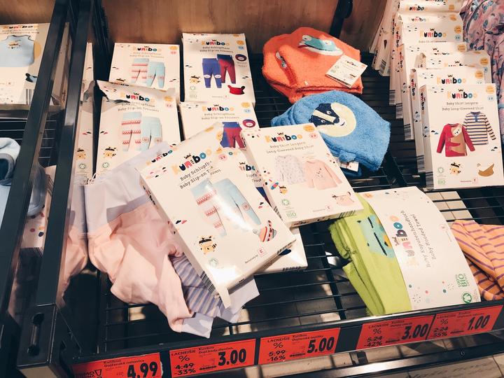 Prvý nákup nás zaviedol do Kauflandu v Trnave na Vladimíra Clementisa. Očká nám zaplesali pri pohľade na ceny a materiál. Veľkou škodou bol práve chaos a neporiadok v regáloch. Kedže sa oblečenie predáva v skutočne krásnych krabičkách, ľudia nevedia odhadnúť veľkosť, balíček otvoria zhodnotia kúpu alebo pohodia kúsok "len tak" späť.