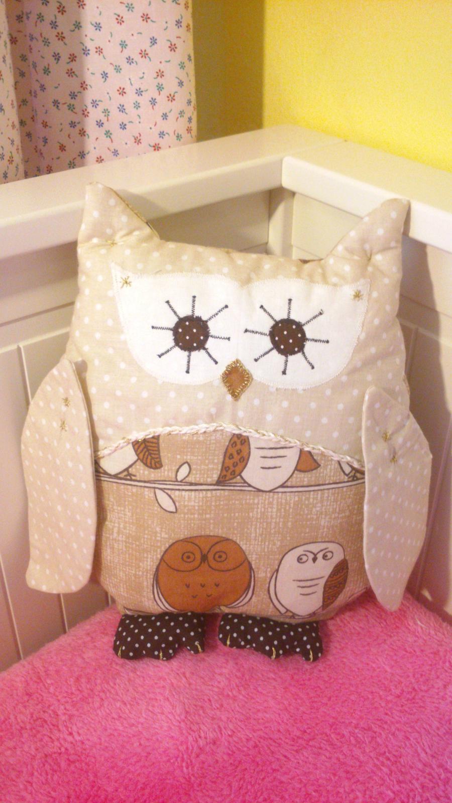 Sovička zlatou niťou dotvorená - vysoká 35 cm a široká 25 cm.