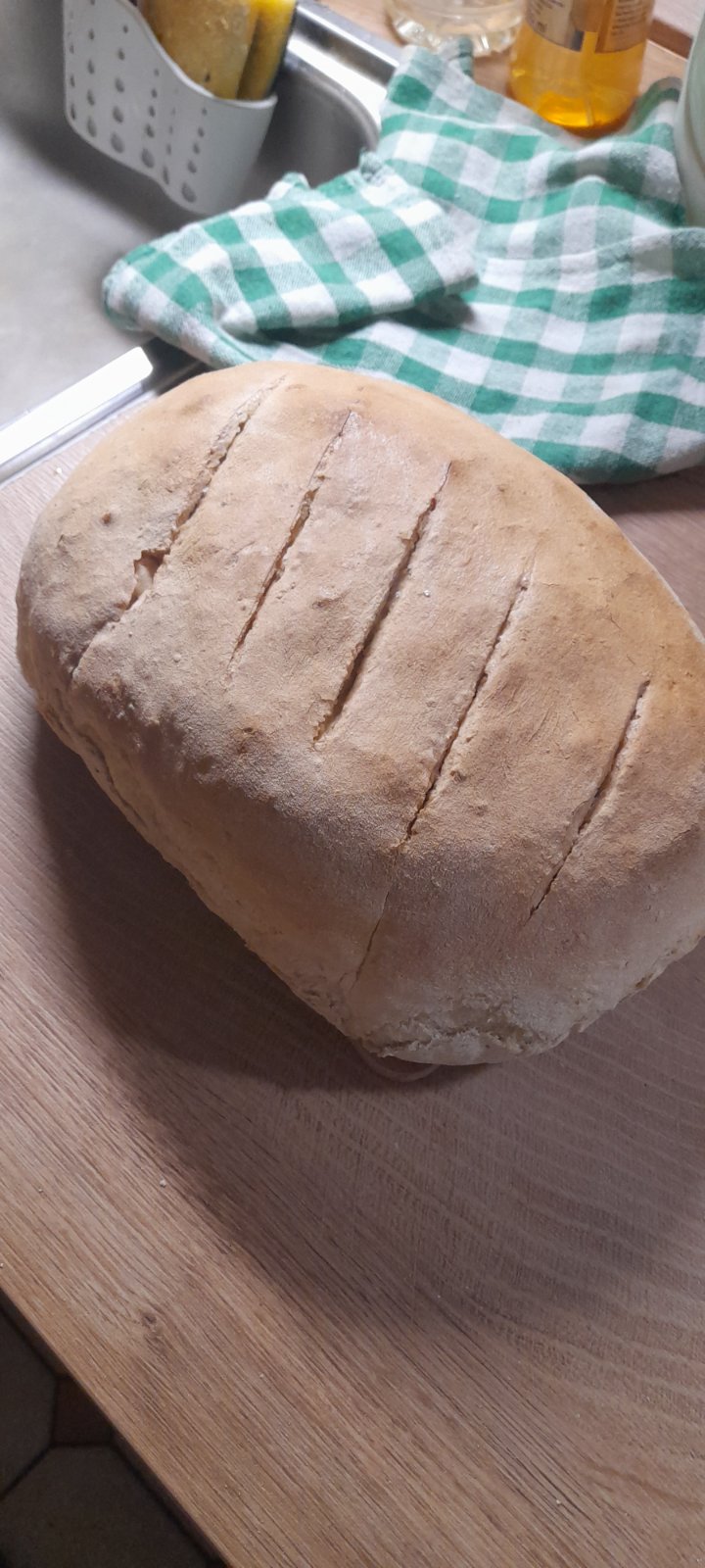 Medzitým nechám trúbu s jánskym sklom rozohriať na 220 stupňov...sklo vyberiem, potriem celé maslom..vykydnem cesto.. zakryté pečiem na 200 stupňoch 40 minút..odokryjem a dopečiem ešte 15 minút...po upečení vyklopím a potriem slanou vodou...