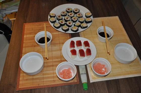 0,5 kávovej lyžičky soľ (morská soľ). Ocot, soľ a cukor zmiešame v menšej nádobe, privedieme do varu a nádobu odložíme na chladné miesto. V Japonsku používajú na prípravu ryže špeciálny hrniec na varenie ryže. U nás je najlepšie použiť nádobu z nehrdzavejúcej ocele. Ryžu najprv 4-5 krát opláchneme v tejto nádobe pod prúdom vody. Po poslednom opláchnutí vylejeme všetku vodu, nalejeme do nádoby 600 ml vody a počkáme asi 30 min. Nádoba by mala byť asi taká veľká, že voda bude nad povrchom ryže asi 1-2 cm. Po 30 minútach dáme nádobu na veľmi silný oheň a zakryjeme pokrievkou. Keď začne ryža vrieť, plameň stíšime. Takto ryžu varíme asi 10 min. Po 10 minútach vypneme plameň a ryžu necháme odstáť v nádobe ešte 10 min. Po 10 minútach ryžu z nádoby vysypeme do drevenej (originál bambusovej), keramickej alebo smaltovanej nádoby. Po vyrovnaní povrchu ryžu polejeme marinádou. Obyčajne používame polievkovú lyžicu. Ryžu premiešame sekavým spôsobom drevenou varečkou a potom ju necháme vychladnúť. Nádobu prikryjeme a odložíme na chladné miesto. Po vychladnutí je ryža pripravená na sushi. Následne už len do nakrájaných plátkov ryby zabalíme ryžu.