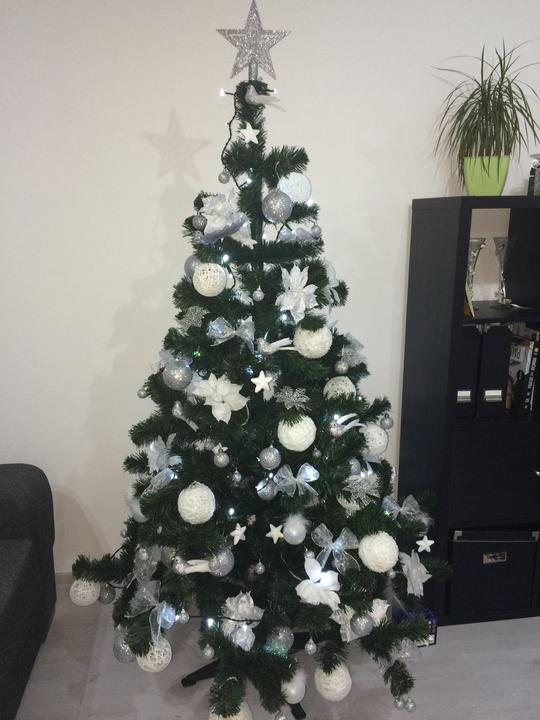 Vianočný stromček od @mmimmka kde použila: 3 veľkosti strieborných guli, striebornu hviezdu, gule s pierkami a vtacika so sivym chvistom, vtacika s bielymi perkami a hviezdu