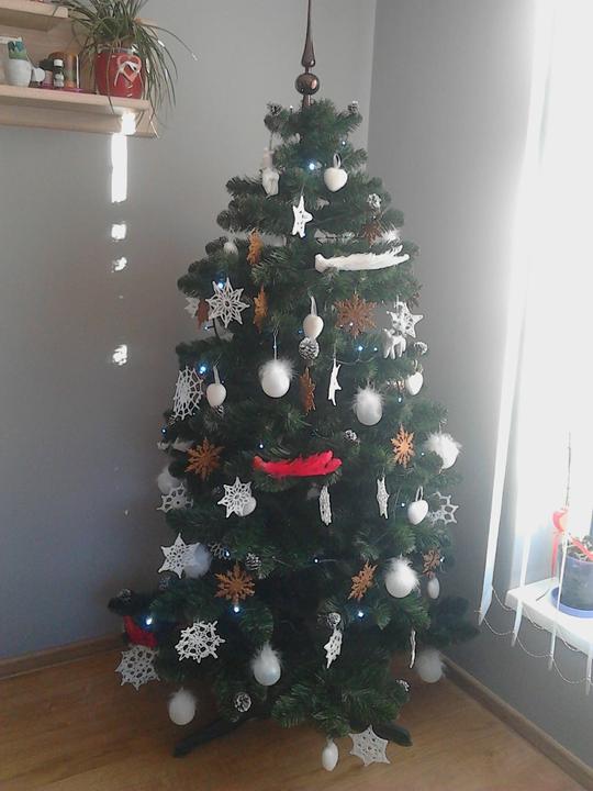 Vianočný stromček od @blcha18 kde použila ozdoby PEPCO : gule s pierkami, sobíkov, srdiečka, vtáčik, baletka