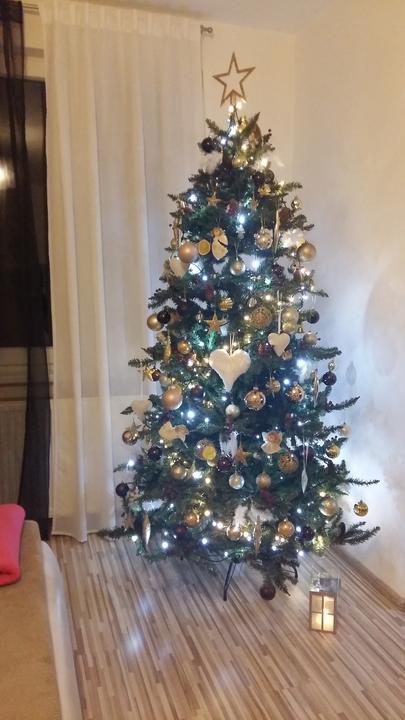 Vianočný stromčeky od @14eri3 na ktorom použila ozdoby PEPCO: malé gule aj veľké, aj tie ako keby vyrezávané, kovové srdiečka, biele pierka a aj lampášik na zemi