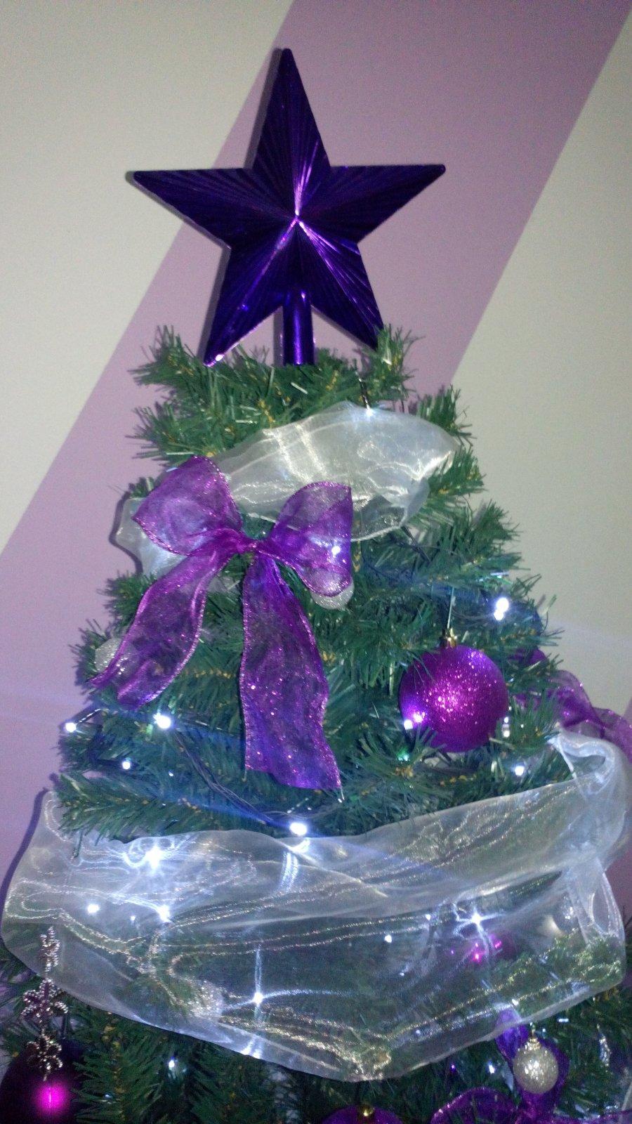Vianočný stromčeky od @natalia_1 na ktorom použila ozdoby PEPCO: strieborné aj fialové gule, hviezda na špici, mašličky vyrobené z ligotavej stuhy
