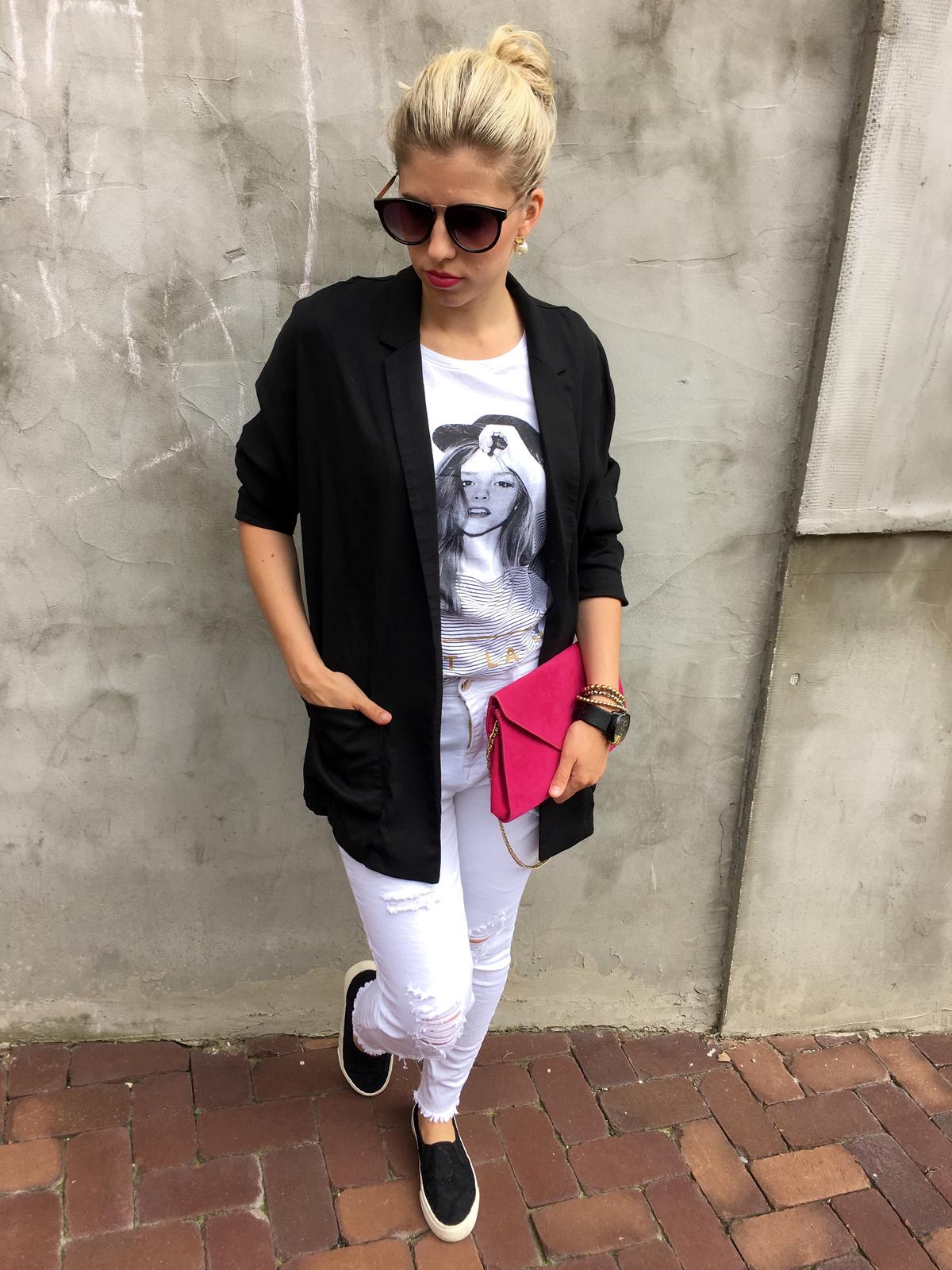 Nesmrteľná čierno-biela kombinácia oživená cyklamenovou. 👛💄Aby som nezabudla tričko za 2,49€ z PEPCO 🔝 #pepco