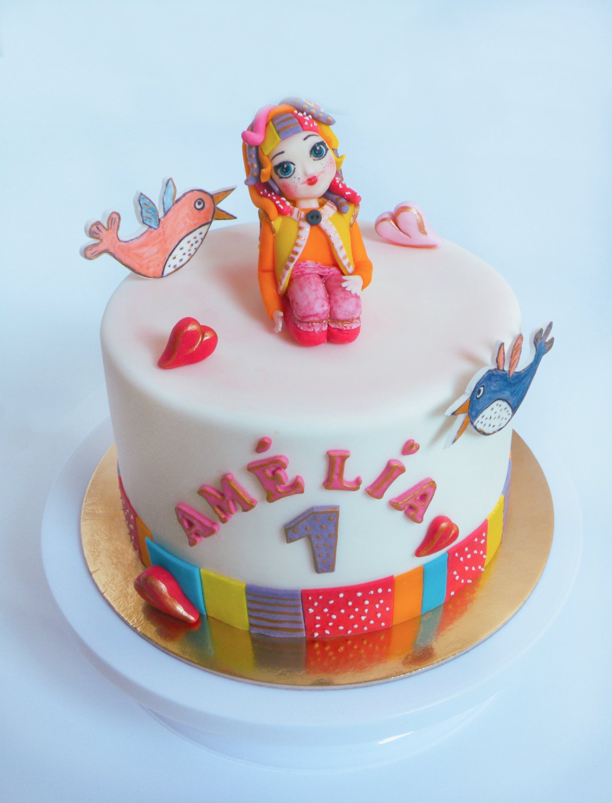 Torta pre dievčatko v téme Fíha tralala. Kakaové korpusy, čokoládový krém, banánový krém, banány, chrumkavá zložka feutelline s čokoládou. Potiahnutá fondánom, dekorácie z poťahovej hmoty a jedlého papiera. Vtáčiky ručne maľované.