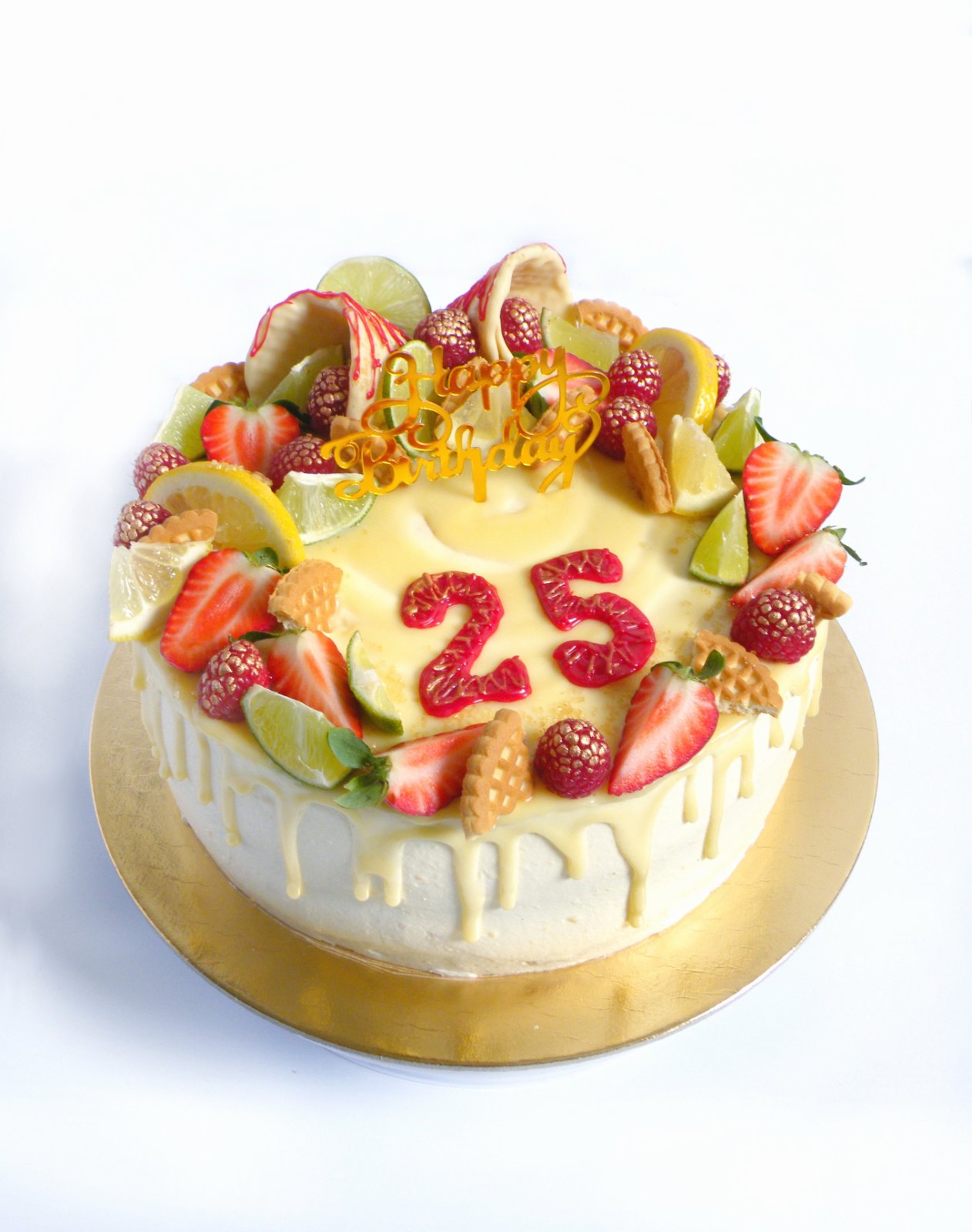 Citrónovo - vanilková... Vanilkové korpusy, citrónový krém, lesné plody, ananás, džem zo žltých sliviek, ganáž z bielej čokolády. Zdobenie: kornútky, čerstvé jahody, maliny, citróny, limetky, sušienky. Váha: 3 kg, priemer 23 cm