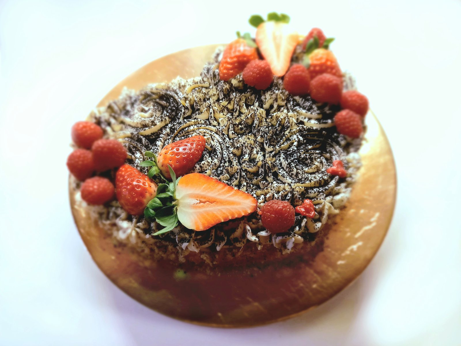 Valentínske srdiečko...Ananásová tortička s lahodným krémom, zdobená čerstvým ovocím, posypaná čiernym kakaom a orechmi.