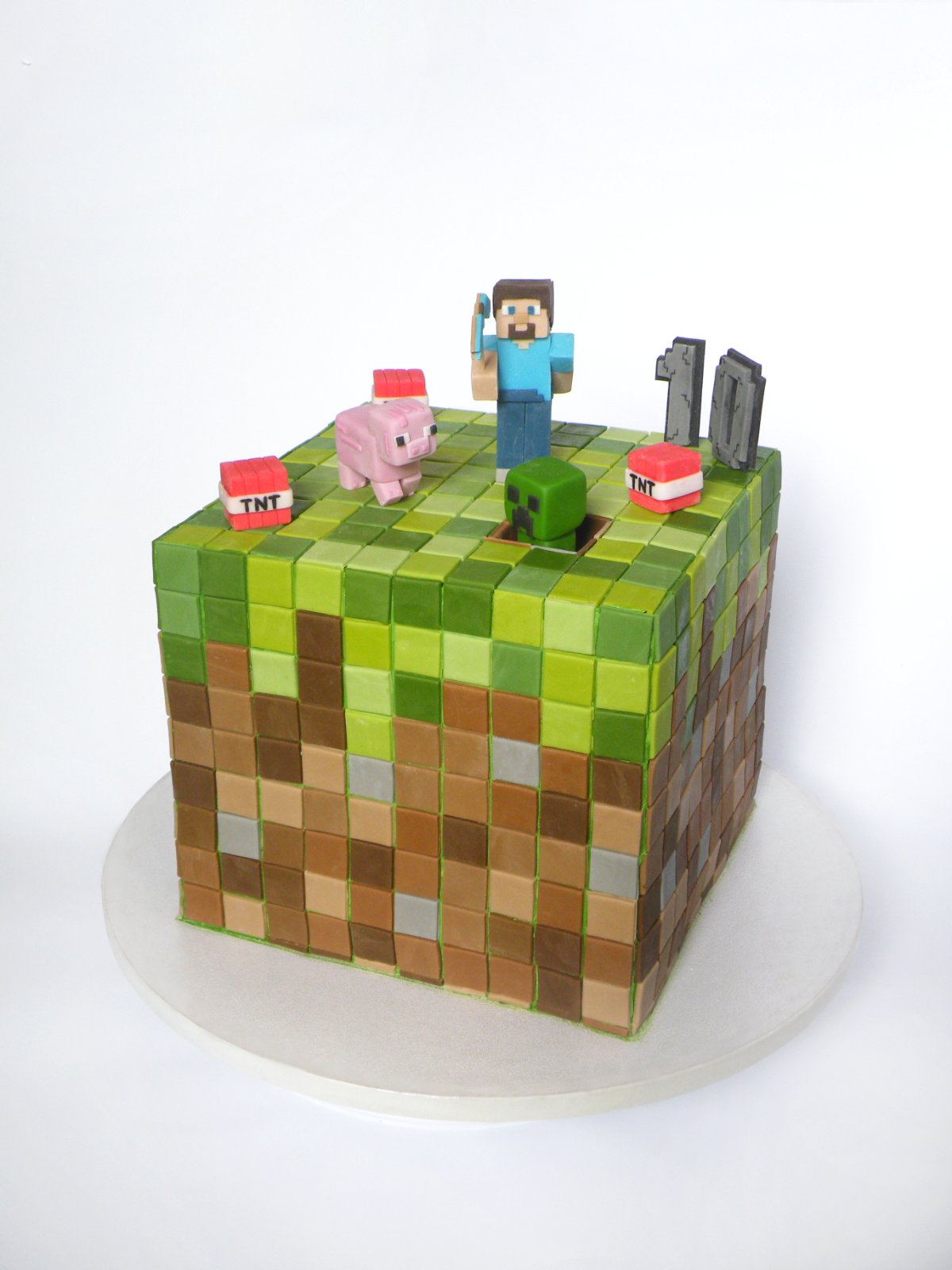 Minecraft torta pre syna k 10.tim rokom. 476 štvorčekov 😁😁 Steve, Creeper, prasiatko, tnt-čka, číslo 10, všetko ručne modelované. Bola to zábava 😀