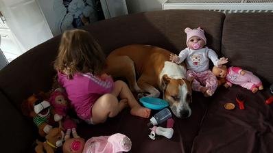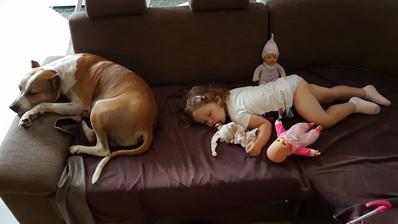 Tiež máme staforda, ale tmavšieho hnedého a je to tiež miláčik našich detí- vnúčat, s ktorými presne tak ako váš spával a strážil a stráží na každom ich kroku. Ja hovorím, ze to nie je pes, a uz vonkoncom nie bojové plemeno, ale naša domáca cica.