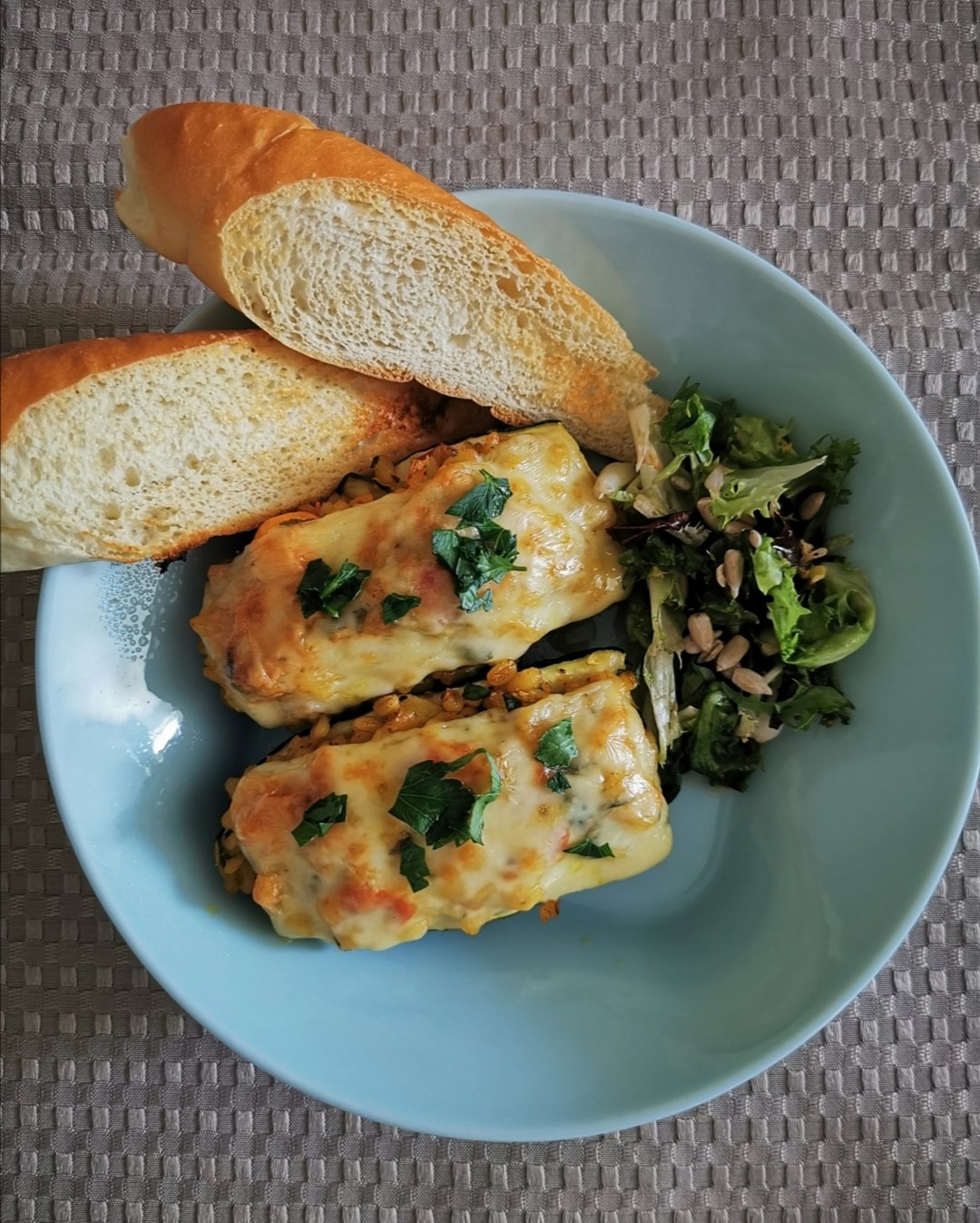 Plnená cuketa -vydlabať stred dať tam vajíčko nastrúhaný syr a paradajky /inú zeleninu/ k tomu šalát/pečené zemiaky